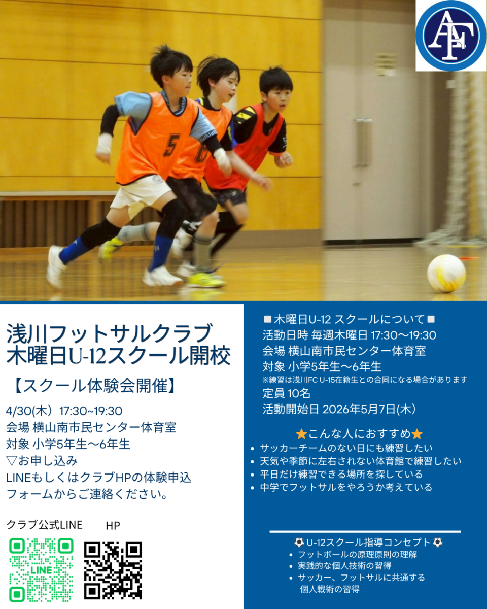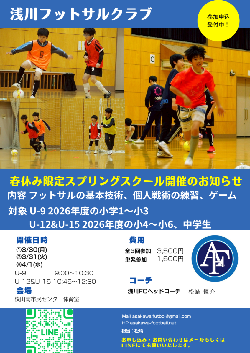 浅川フットサルクラブのU-15クラスでは2026年度に向け現小学6年生~中学1年生の選手を募集しています。 サッカーよりフットサルがやりたい、進学予定の中学にサッカー部がない、部に専門コーチがいない、時間や…