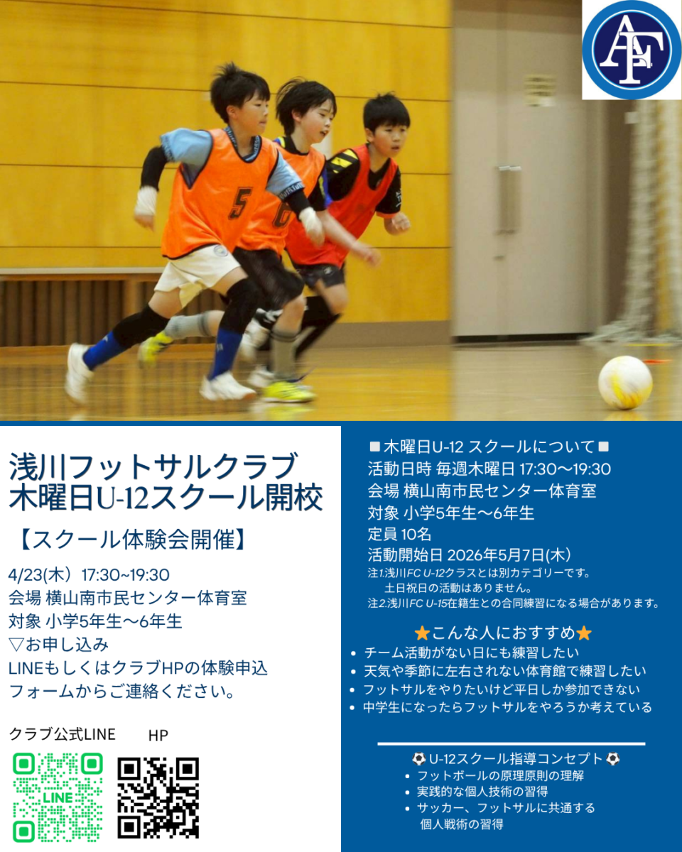 浅川フットサルクラブでは小学5年生と6年生を対象とした木曜日U-12スクールを5月に開校します。 ゴールデンエイジと呼ばれるU-12年代でフットサルのトレーニングをすることで、フットサル選手としての可能性を…